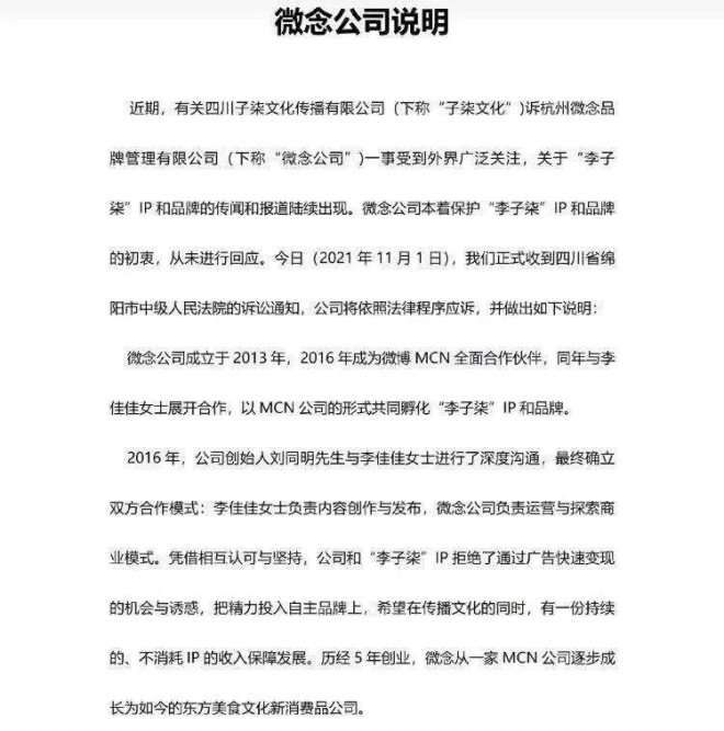 這份聲明首先表態(tài),自雙方合作以來,從未干涉過李子柒的內容創(chuàng)作,也從未想過、從未控制過任何@李子柒的相關平臺賬號。并且解釋稱早在一年前杭州微念便與李子柒進行溝通,最終未果。但這份聲明并未透露當時的具體協(xié)議內容。