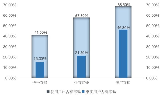 但由于2020年抖音和快手GMV中有近2/3的規(guī)模是通過引流到淘寶天貓、京東等平臺實現(xiàn)的,因此,整體來看,從嚴格口徑上淘寶直播仍具有相對優(yōu)勢。消費者協(xié)會發(fā)布的關(guān)于三大平臺用戶占有率的數(shù)據(jù)也說明了這一點。數(shù)據(jù)顯示,2020年,使用淘寶直播的消費者占比為68.5%,同期,抖音和快手分別為57.8%和41%;而在忠實用戶方面,忠淘寶直播用戶占比46.3%,同期抖快分別為21.2%和15.3%。