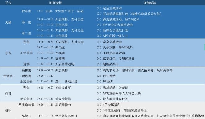 圖7:主要平臺雙11大促時間安排和規(guī)則玩法 數(shù)據(jù)來源:官方新聞、36氪整理