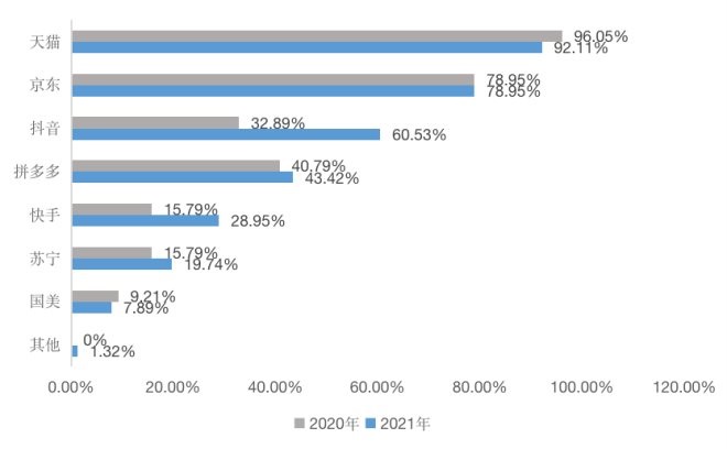 根據(jù)億邦智庫的調(diào)研數(shù)據(jù),針對今年雙11活動,有92.11%的被調(diào)研企業(yè)參與了天貓的促銷活動,這一比例較2020年小幅下滑3.94個百分點。但縱向?qū)Ρ,天貓依舊是今年商家參與度最高的電商平臺,較第二名京東高出13.16個百分點。值得注意的是,今年以抖音、快手為代表的興趣電商平臺的商家參與度實現(xiàn)快速增長,2021年雙11抖音的商家參與度達到60.53%,超越拼多多成為排名第三的電商平臺,且參與度占比較去年同期大幅上漲27.64%;快手今年則為28.95%,較去年同期上漲13.16%。