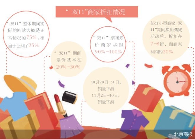 “實際上所有的優(yōu)惠歸根結(jié)底還是商家買單!币晃簧碳蚁虮本┥虉笥浾咄嘎,“‘雙11’少賺不少,回款是正常情況下的75%。”但又“不得已”參加,因為不參加就徹底沒有流量了。而對于有些利潤本就沒有20%的小商家來說,7-8折的價格意味著虧損。