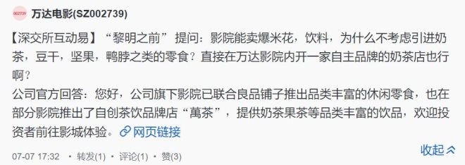 今年7月,在投資者互動(dòng)平臺(tái)中,萬(wàn)達(dá)電影也回復(fù)稱,公司在部分影院推出了自創(chuàng)茶飲品牌“萬(wàn)茶”。