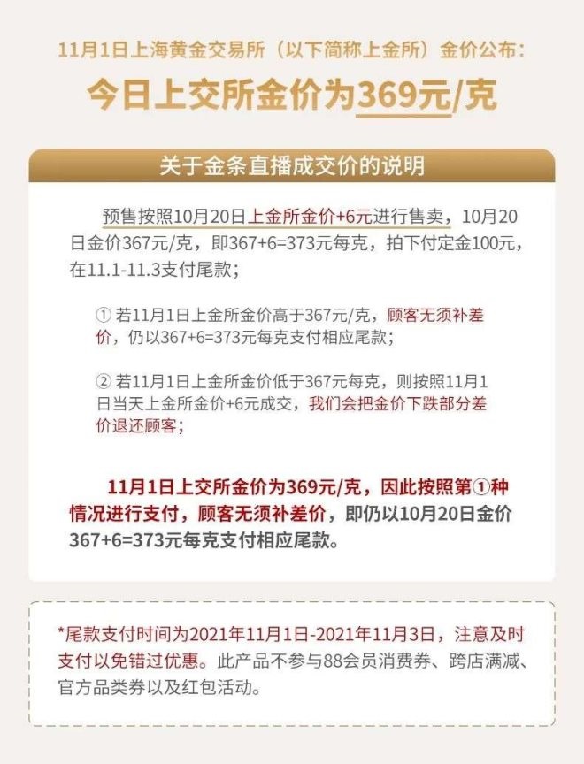 “能保值、更劃算”也成為金條的主要賣(mài)點(diǎn)。今年雙11,薇婭和李佳琦就利用金價(jià)實(shí)時(shí)波動(dòng)的特點(diǎn),玩起了“保價(jià)”玩法:產(chǎn)品的售價(jià)以10月20日預(yù)售當(dāng)天的上交所金價(jià)為基準(zhǔn),在付尾款當(dāng)天,若金價(jià)下跌,消費(fèi)者將獲得相應(yīng)的退款,若金價(jià)上升,則無(wú)需額外支付。