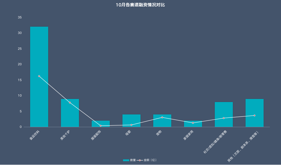 具體來(lái)看,在10月份的投融資數(shù)量中,只有食品飲料賽道遙遙領(lǐng)先,在數(shù)量上,是第二位的美妝個(gè)護(hù)賽道的3倍之多,金額也超過(guò)2倍。