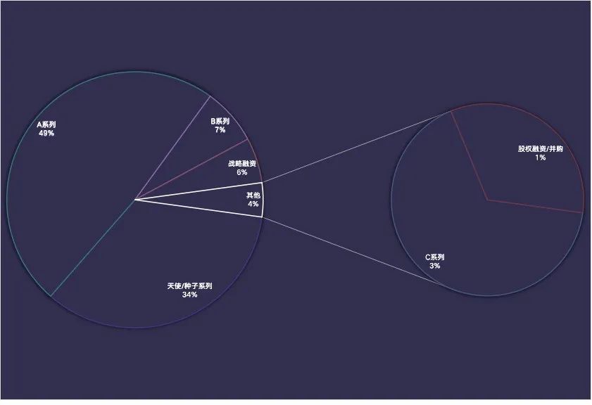 另外從融資輪次上來(lái)看,A輪系列的比重較天使輪越來(lái)越高,8月兩者相差8%,但9月差距達(dá)12%,10月差15%......資本對(duì)早期項(xiàng)目的謹(jǐn)慎度逐步提高。