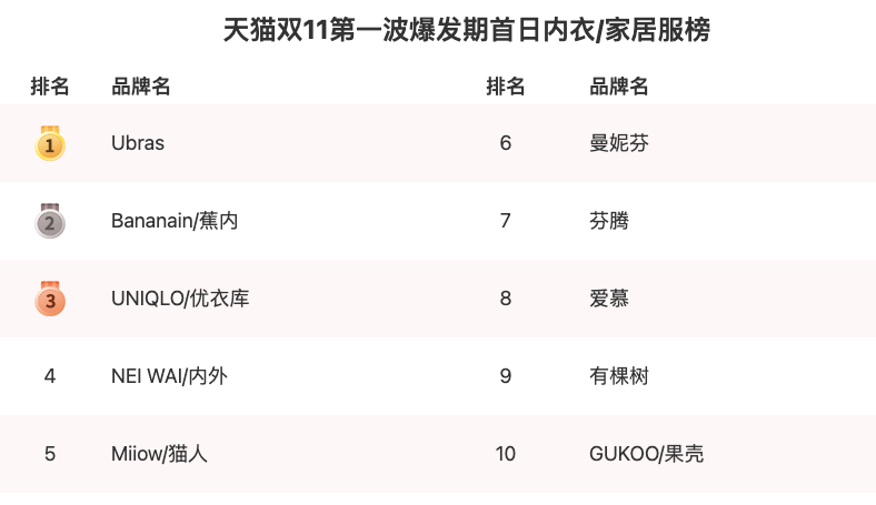 再如,Ubras、蕉內(nèi)、內(nèi)外也登上天貓雙11內(nèi)衣/家居服榜,在這一大類(lèi)目中,超過(guò)了優(yōu)衣庫(kù)。