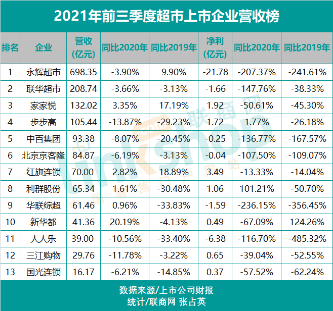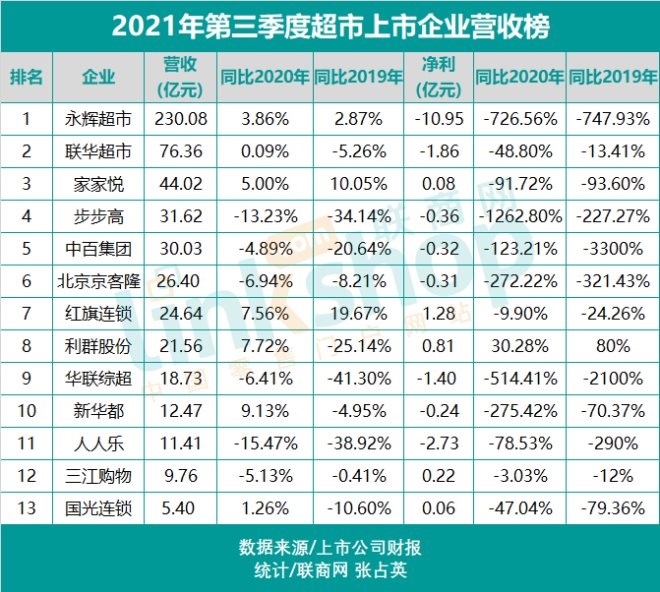 如果與2019年同期相比,僅有3家企業(yè)實(shí)現(xiàn)營收增長,分別為永輝超市、家家悅和紅旗連鎖,這與三家企業(yè)的門店數(shù)量快速增長有關(guān);而其余10家企業(yè)全部出現(xiàn)營收下滑,下滑幅度最大的為華聯(lián)綜超,降幅高達(dá)41.30%。