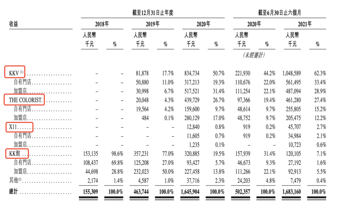 根據(jù)招股書,在KK集團(tuán)的680家門店中,截止到2021年6月,KKV門店數(shù)量281家;THE COLORIST調(diào)色師門店數(shù)量240家;X11門店數(shù)量11家,KK館門店數(shù)量107家。KK集團(tuán)的零售業(yè)務(wù)包含自有門店和加盟店,其中加盟店數(shù)量多于自有門店。