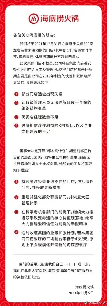 同一天,海底撈通過官方微博發(fā)布“致關(guān)心海底撈的朋友的一封信”,表示部分門店經(jīng)營未達預(yù)期主要源于2019年開始的快速擴張策略。具體表現(xiàn)在:部分門店選址出現(xiàn)失誤;內(nèi)部組織架構(gòu)變革讓各級管理人員“無法理解且疲于奔命”;優(yōu)秀店經(jīng)理數(shù)量不足;過度相信連住利益的KPI指標(biāo),以及企業(yè)文化建設(shè)的不足。