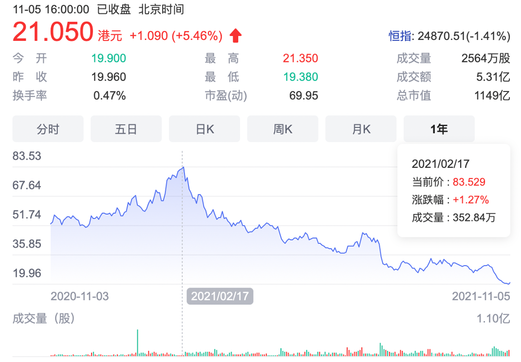 今年2月之后,海底撈的股價持續(xù)走低。11月5日,海底撈的股價為21.05港元,較2月17日的最高點83.53港元,跌去74.80%,目前海底撈的市值為1149億港元,較最高點蒸發(fā)超3300億港元。