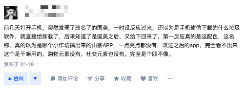 知乎和微博上,關(guān)于“如何看待國美APP改名為真快樂?”的話題討論中,大部分網(wǎng)友認為“真快樂”不符合電商平臺的調(diào)性,改名是個敗筆;當然也有人認為“真快樂”簡單好記,凸顯了升級后的國美在社交化電商上的嘗試。