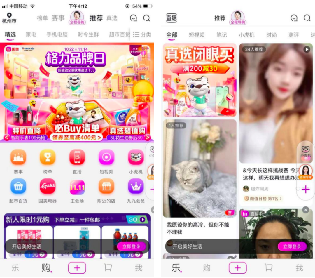 此外,“樂”板塊中呈現(xiàn)的視頻與圖文文案與購物的聯(lián)系并不大,頁面里“我原諒你的高冷,但你不能不理我”等內(nèi)容很難喚醒用戶購物欲望,若不是有國美那只小老虎的IP存在,別人還以為進入了某個直播交友的社交軟件。