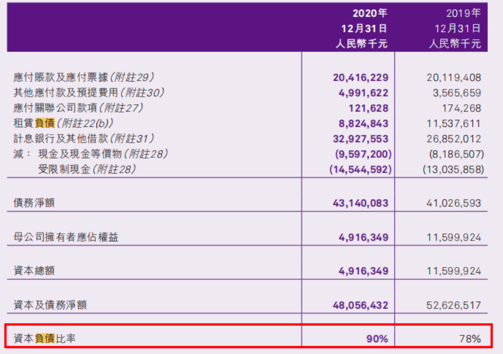 2017至2020年,國美負債合計分別為456.98億元、496.58億元、637.11億元和692.26億元,資產(chǎn)負債率一路攀升,達到了90%。