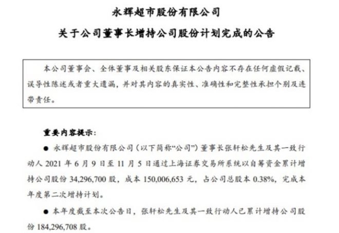 11月5日,永輝超市發(fā)布公告稱,董事長(zhǎng)張軒松及其一致行動(dòng)人2021年6月9日至11月5日通過(guò)上海證券交易所系統(tǒng)以自籌資金累計(jì)增持公司股份3429.67萬(wàn)股,成本1.5億元,占公司總股本0.38%,完成本年度第二次增持計(jì)劃。