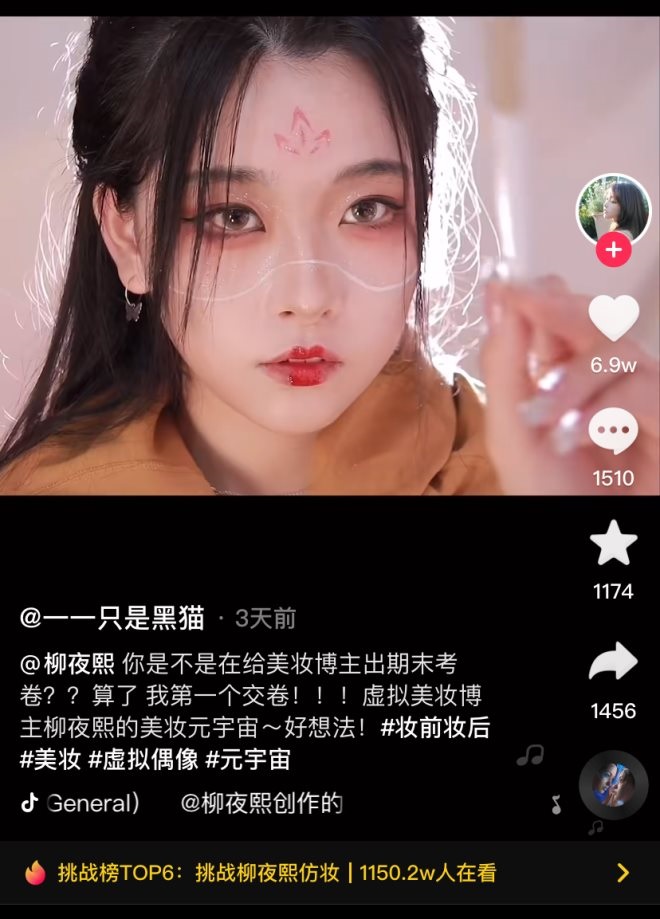 柳夜熙的走紅還成為一眾短視頻博主的流量密碼。截至11月5日,抖音有關#柳夜熙#的話題已有超過了1.6億的播放量。#柳夜熙仿妝系列#的話題還登上抖音熱榜,占據(jù)挑戰(zhàn)榜TOP 6的位置,有超過1150萬在看。而有關#柳夜熙為何爆火#的話題,也在抖音引起熱議。這些天,似乎只要帶上“柳夜熙”的標簽,就會帶來流量。
