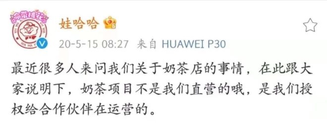 關(guān)于娃哈哈奶茶店的經(jīng)營問題,其實早在去年娃哈哈官博就有聲明:“最近很多人來問我們關(guān)于奶茶店的事情,在此跟大家說明下,奶茶項目不是我們直營的哦,是我們授權(quán)給合作伙伴在運(yùn)營的!