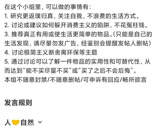 “消費(fèi)主義有限抵抗”小組簡介里寫明了這樣一條準(zhǔn)則:“不被消費(fèi)主義裹挾,不囤貨,不浪費(fèi),有限消費(fèi),和自然和諧共處”。在這里,“回歸真實(shí)”“極簡生活”與“斷舍離”成了經(jīng)驗(yàn)貼最常出現(xiàn)的關(guān)鍵詞,組內(nèi)豆友Alex(化名)這樣闡述自己對“消費(fèi)主義”的理解:“用金錢去衡量一切的觀念會割裂人與人之間的關(guān)懷,所以我時常會告訴自己要去愛一個個具體的人!