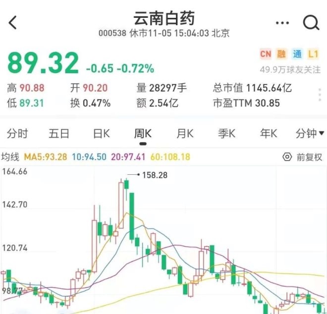 今年年初云南白藥的股價一度最高上漲至159.38元,市值一度超過2000億元,但截止到11月5日,其股價已經跌落至89.32元,市值1145元。