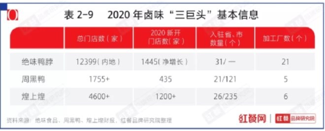 一直以來,鹵味行業(yè)都有著“三國鼎立”的說法。無論是品牌勢能還是渠道門店,絕味、周黑鴨和煌上煌等頭部品牌一直牢牢站穩(wěn)前三的位置。據(jù)不完全統(tǒng)計,截至2020年末,絕味鴨脖門店數(shù)達到12000余家,周黑鴨 1700余家,煌上煌4600余家。