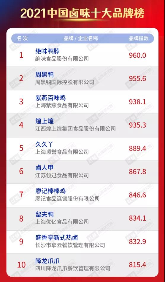 其中,2021中國鹵味十大品牌揭曉,絕味鴨脖、周黑鴨、紫燕百味雞、煌上煌、久久丫、鹵人甲、廖記棒棒雞、留夫鴨、盛香亭新式熱鹵、降龍爪爪等品牌斬獲殊榮。