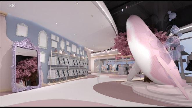 根據(jù)「詩(shī)與萬(wàn)花鏡」的設(shè)想,女孩們走進(jìn)來(lái)后會(huì)發(fā)現(xiàn)這是一個(gè)夢(mèng)幻的、脫離現(xiàn)實(shí)的地方,她能從中獲得收集美和裝扮美的快感,最終形成一個(gè)炫耀美的極大的快感;同時(shí),這也是一個(gè)從現(xiàn)實(shí)到夢(mèng)幻,再?gòu)膲?mèng)幻到現(xiàn)實(shí)的一個(gè)過(guò)程。