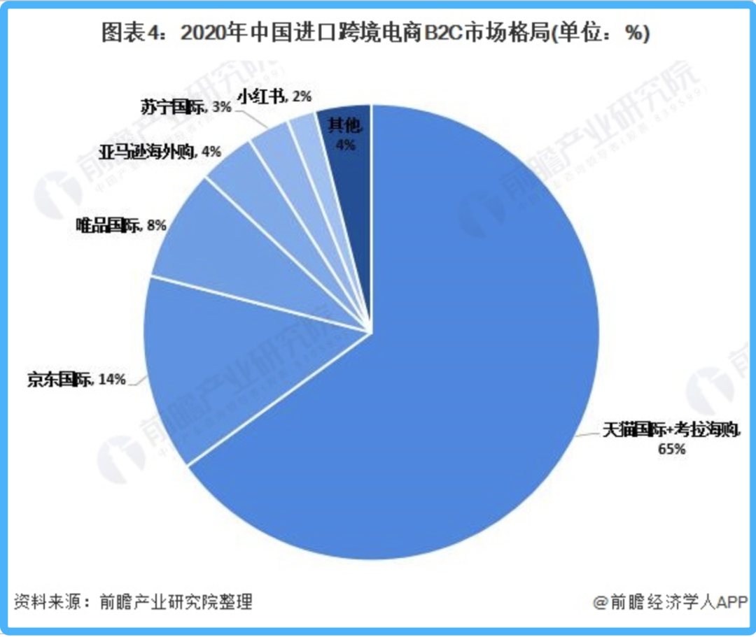 前瞻產(chǎn)業(yè)研究院發(fā)布的報(bào)告指出,中國(guó)進(jìn)口跨境電商B2C市場(chǎng)已經(jīng)呈現(xiàn)出了“一超多強(qiáng)”的格局,2020年天貓國(guó)際+考拉海購(gòu)占據(jù)該市場(chǎng)65%的份額,阿里系在進(jìn)口2C端的地位穩(wěn)固;而在跨境出口方面,淘寶系雖不及亞馬遜的市場(chǎng)份額(22%),但也以5%的市場(chǎng)占比名列第二。