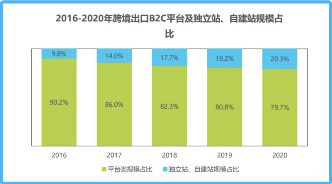 《研究報(bào)告》顯示,2019年有26%的外貿(mào)企業(yè)都選擇了自建獨(dú)立站或品牌站,雖然平臺(tái)類仍占據(jù)了較高市場(chǎng)比重,但獨(dú)立站發(fā)展勢(shì)頭更為兇猛,預(yù)計(jì)2020年獨(dú)立站、自建站市場(chǎng)規(guī)模占比會(huì)由2016年的9.8%提升至20.3%,未來(lái)這個(gè)市場(chǎng)還將持續(xù)擴(kuò)增。