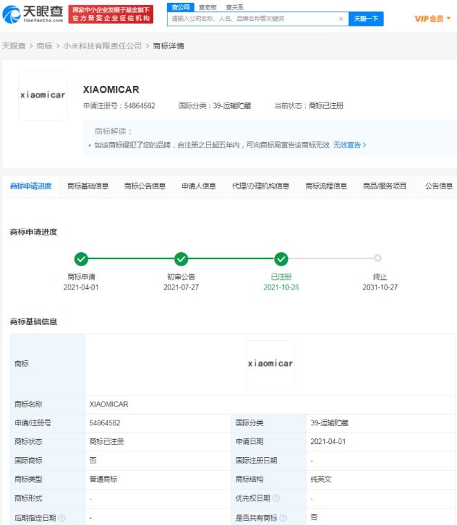 據(jù)36氪報(bào)道,天眼查App顯示,近期,小米科技有限責(zé)任公司申請注冊的“小米汽車”“XIAOMICAR”“MICAR”“米車”商標(biāo),除部分國際分類“駁回復(fù)審中”“等待實(shí)質(zhì)審查”外,大多數(shù)狀態(tài)變更為“商標(biāo)已注冊”和“初審公告”,這些商標(biāo)大多申請于2021年4月,國際分類涉及運(yùn)輸工具、教育娛樂、運(yùn)輸貯藏等。