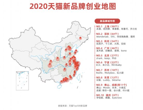 2020年天貓Top500新品牌的所在地,上海以90個品牌數(shù)遠超深圳、杭州、廣州、北京等地,排名第一。2020年9月,天貓與CBNData聯(lián)合發(fā)布的《2020新國貨之城報告》顯示,上海出品的永璞咖啡、拉面說、薄荷健康、布魯可等新品牌,均拿下天貓銷量細分品類第一,注冊地為上海的新銳品牌更貢獻了全國近六分之一的銷售額。