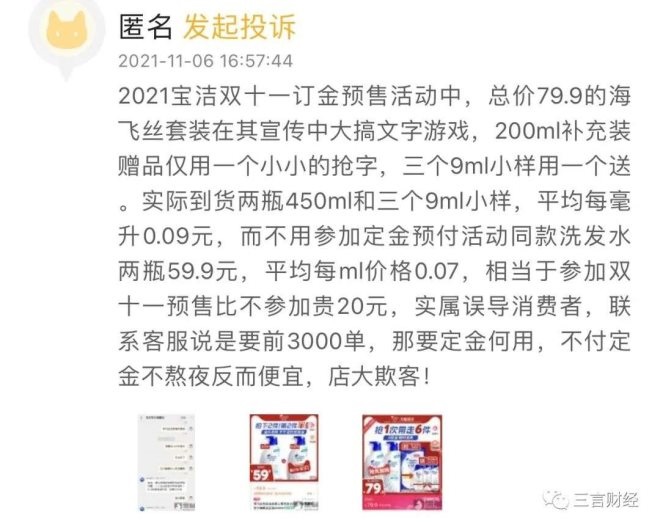 這名消費(fèi)者投訴稱,在今年寶潔“雙十一”預(yù)售活動(dòng)中,參加預(yù)售洗發(fā)水套裝總價(jià)格79.9元;而不參加預(yù)售的同款洗發(fā)水兩瓶59.9元。相當(dāng)于參加雙十一預(yù)售比不參加反而貴了20元。