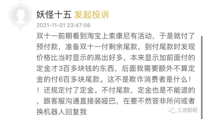 有消費(fèi)者講述自己經(jīng)歷稱,自己在預(yù)售期看到索康尼做活動(dòng),算上預(yù)付定金只需三百余元就可以購(gòu)得商品。但在支付尾款日時(shí),這名消費(fèi)者發(fā)現(xiàn)索康尼的這款商品不算上定金僅尾款就漲到六百余元。而且商家規(guī)定如果支付了定金,不支付尾款定金也不能退。