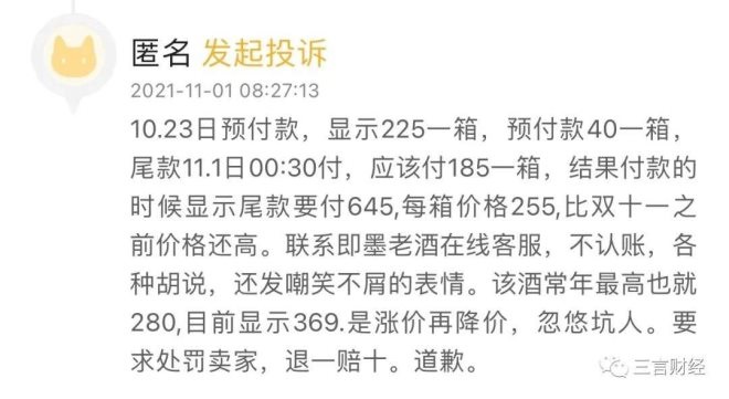 有消費(fèi)者投訴稱,自己10月23日預(yù)付定金購(gòu)買(mǎi)即墨老酒,當(dāng)時(shí)顯示225元一箱,預(yù)付定金40元,尾款每箱185元,于11月1日支付。