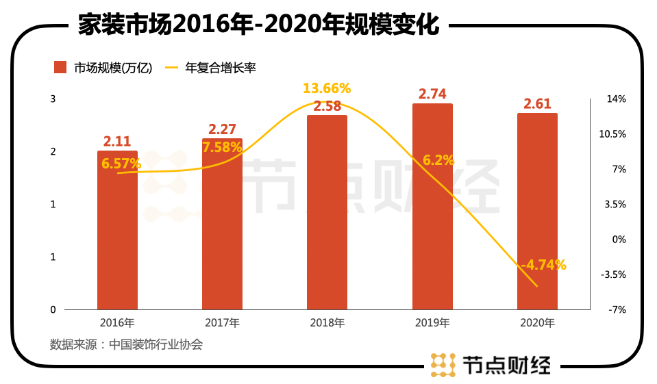 據(jù)中國裝飾行業(yè)協(xié)會數(shù)據(jù)顯示,2015年至2019年,我國家裝行業(yè)的市場規(guī)模持續(xù)增長,年復(fù)合增長率CAGR達到8.46%,2019年市場規(guī)模達到2.74萬億元。由于受疫情影響,2020年家裝市場規(guī)模首次下滑,其市場規(guī)模為2.61萬億元,同比下降4.74%。而據(jù)前瞻研究院預(yù)計,隨著居民消費熱情的提高,2021年家裝行業(yè)市場將迎來補償性反彈。