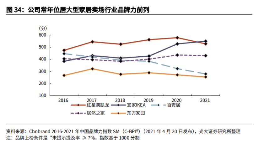 作為家居龍頭,紅星美凱龍最牢固的基本盤,應(yīng)當(dāng)是公司35年來建立起的行業(yè)地位、賣場規(guī)模以及品牌優(yōu)勢。