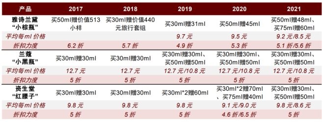 據(jù)中金數(shù)據(jù)顯示,從每毫升(ml)價格口徑來看,雅詩蘭黛小棕瓶、蘭蔻小黑瓶、資生堂紅腰子2021年“雙十一”最低折扣價分別為8.5元/10.8元/8.6元,其中小棕瓶相比2019年下調(diào)21.3%,小黑瓶、紅腰子相比2017年分別下調(diào)15.0%/12.2%。中金認(rèn)為,性價比提升加持下海外品牌2018年開始搶占淘系平臺雙11暢銷榜頭部位置。