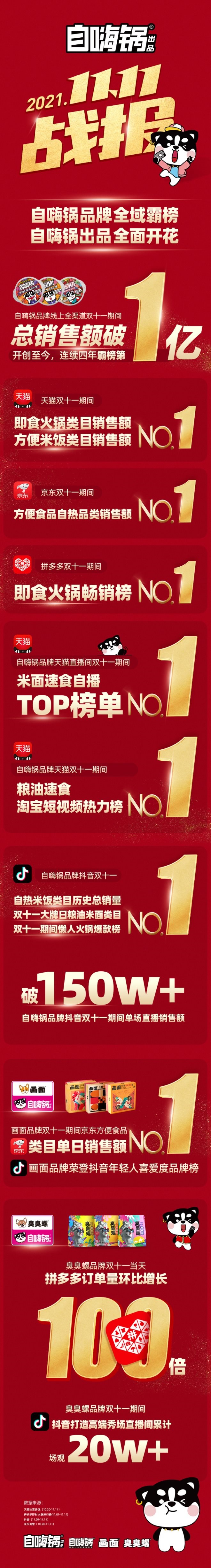 根據(jù)多平臺(tái)發(fā)布的數(shù)據(jù),自嗨鍋品牌線上全渠道雙11期間總銷售額突破1億元,這是自嗨鍋品牌開創(chuàng)至今,連續(xù)四年霸榜第1。