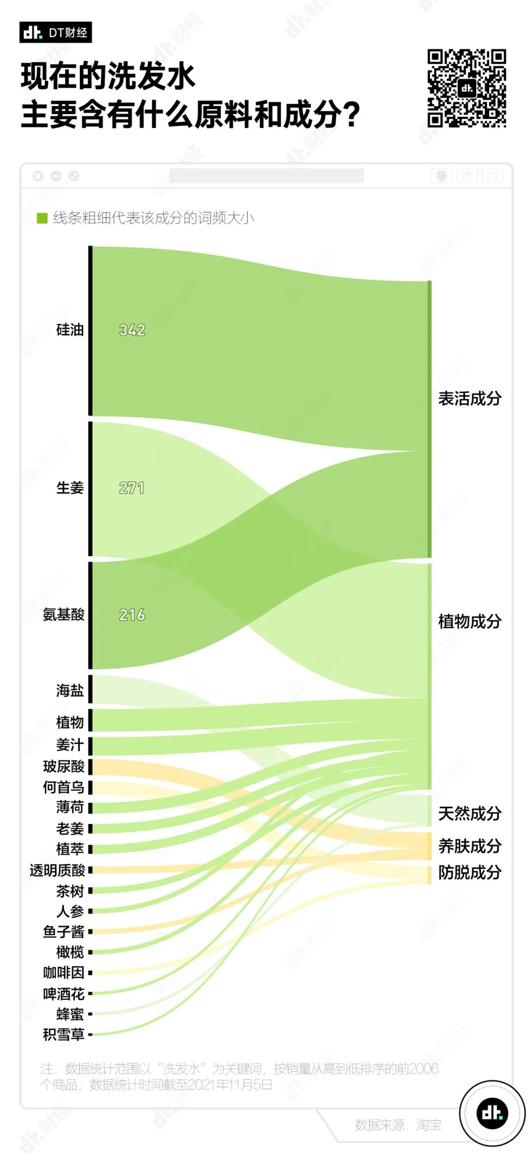 在我們爬取的淘寶數(shù)據(jù)樣本中,出現(xiàn)次數(shù)最多的成分TOP3分別是硅油、生姜、氨基酸。以硅油和氨基酸為代表的表活成分在所有成分中占比最大,其次是以生姜為代表的植物成分、海鹽代表的天然成分、魚子醬、玻尿酸代表的養(yǎng)膚成分,最后是由何首烏和咖啡因組成的防脫成分。