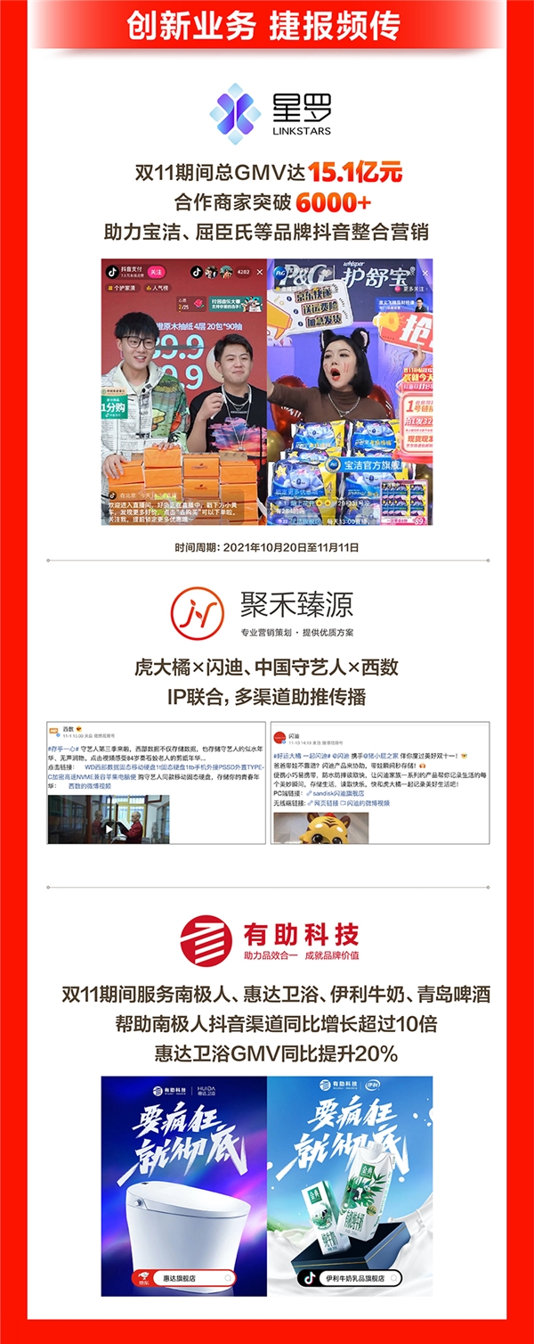 戰(zhàn)報顯示,值得買科技旗下子公司星羅整個雙11期間(10月20日至11月11日)總GMV同比增長206%,合作商家突破6000家,并成功助力寶潔、屈臣氏等品牌的抖音整合營銷。為品牌商提供全域運營服務的子公司有助科技則助力惠達衛(wèi)浴、伊利、青島啤酒、EraClean完成雙11期間的全域營銷,其中,整個雙11期間南極人抖音渠道實現倍速增長;聚禾臻源助力多家客戶品牌實現IP聯名破圈營銷。