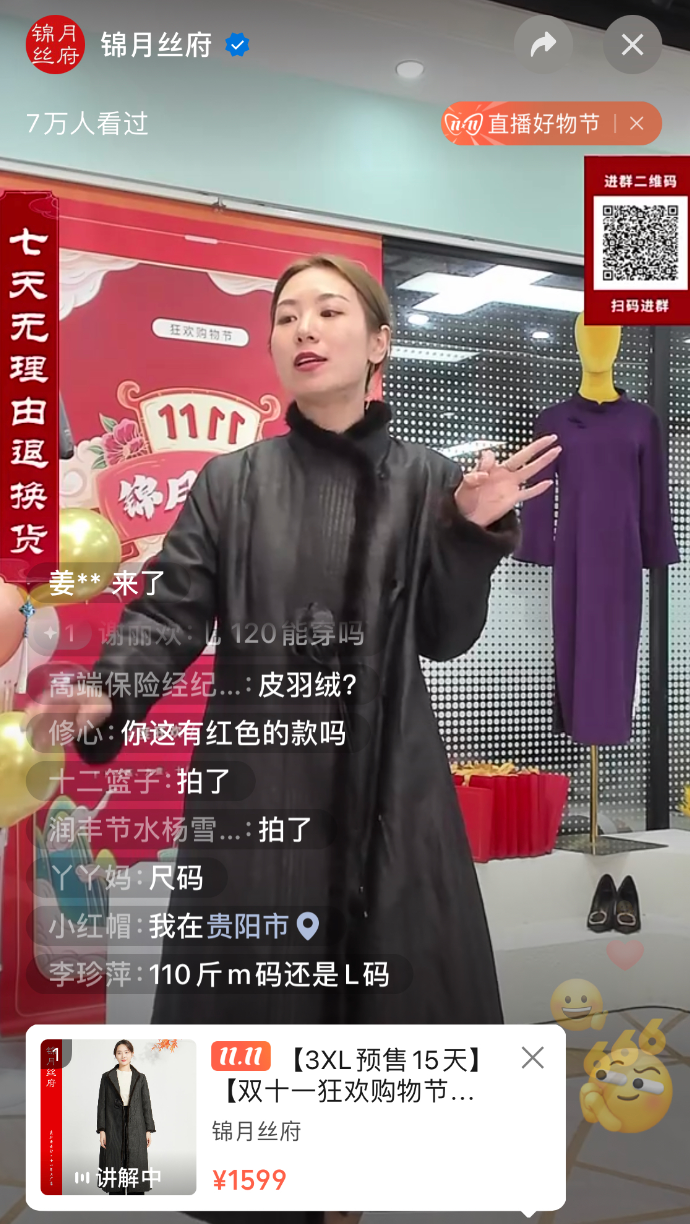原來(lái)在電商平臺(tái)直播過(guò)一段時(shí)間的錦月絲府,今年雙11選擇了視頻號(hào)直播。其創(chuàng)始人馮掌柜表示,不少商家和他們一樣,在視頻號(hào)直播,是外部壓力和內(nèi)部需求綜合考慮的結(jié)果。“電商平臺(tái)獲取公域流量的成本太高,競(jìng)爭(zhēng)愈發(fā)激烈,對(duì)于商家來(lái)說(shuō),在私域建立自己的會(huì)員體系,而不過(guò)分依賴公域流量,才是更好的選擇!