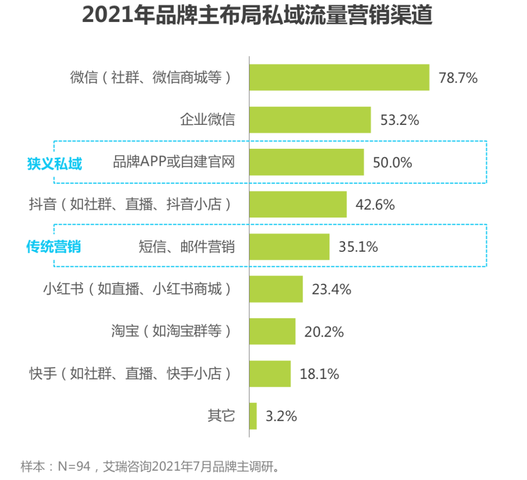 實(shí)際上,經(jīng)歷過(guò)私域大爆發(fā)的2020年,大多數(shù)商家已經(jīng)視私域流量為“必要”的一畝三分地。根據(jù)艾瑞品牌主調(diào)研數(shù)據(jù),微信及企業(yè)微信是品牌主發(fā)力私域的主要陣地,分別有78.7%及53.2%的品牌主布局。