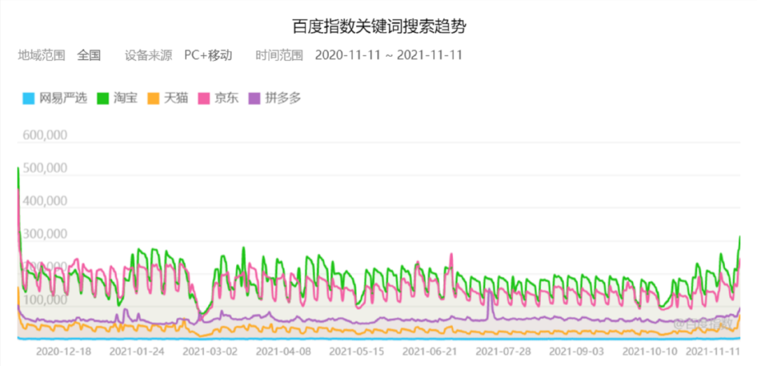 百度指數(shù)顯示,從去年雙十一到今年雙十一的一年間,網(wǎng)易嚴(yán)選在幾個(gè)電商平臺的搜索量一直墊底。海豚智庫行業(yè)調(diào)研的數(shù)據(jù)表明,在2018年排名第六的網(wǎng)易嚴(yán)選,如今已經(jīng)掉落20名開外。