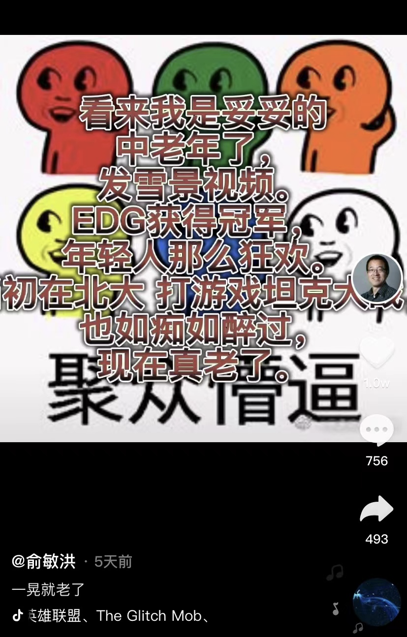 在EDG奪冠后,俞敏洪在抖音上感慨自己老了