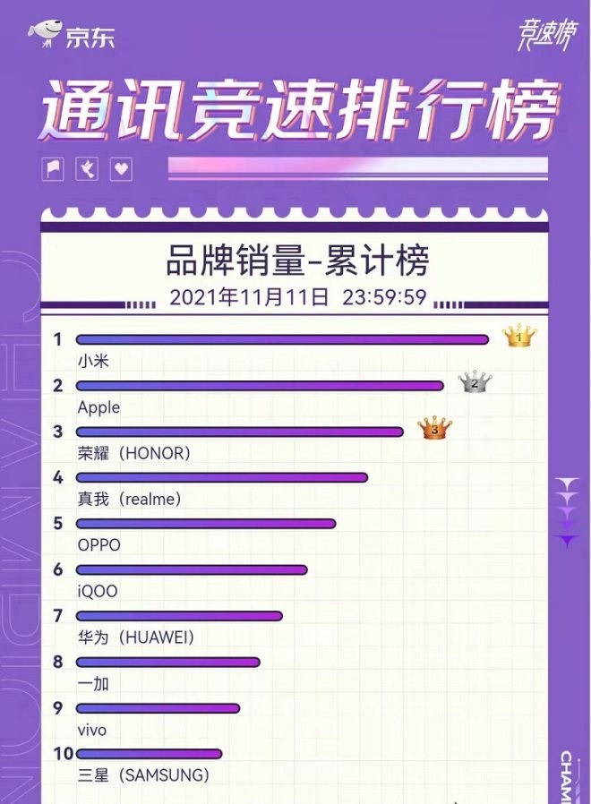 其中,京東手機競速榜顯示,在截至11月11日23:59的整個“雙11”促銷期間,京東平臺手機品牌銷量累計排名前五的品牌分別為小米、蘋果、榮耀、realme、OPPO;品牌銷售額累計排名前五的品牌分別為蘋果、小米、榮耀、華為、iQOO。其中,蘋果在京東平臺的銷售額突破百億元。