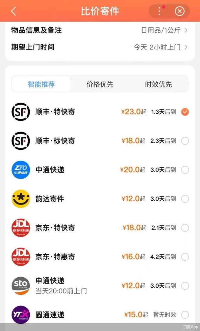 在價(jià)格上,記者注意到,百度的“比價(jià)寄件”功能能同時(shí)展示7家快遞的服務(wù)價(jià)格,并標(biāo)明了時(shí)效。例如從北京寄往重慶,韻達(dá)的費(fèi)用為12元起,時(shí)效為3天;順豐特快寄價(jià)格最貴,為23元起,時(shí)效為1.3天。為了吸引用戶下單,百度除了提供德邦6元立減券,還發(fā)出10元立減券,不過用戶得邀請(qǐng)三個(gè)好友助力才能領(lǐng)取。