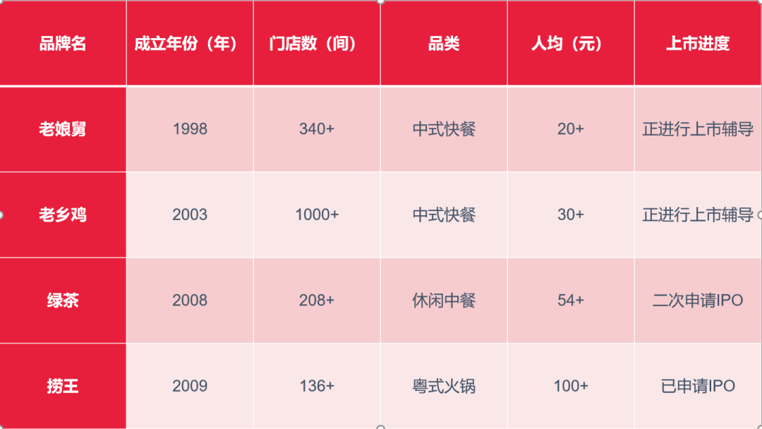 據(jù)筷玩思維了解,老娘舅、老鄉(xiāng)雞、綠茶、撈王等品牌正在計(jì)劃、排隊(duì)上市。