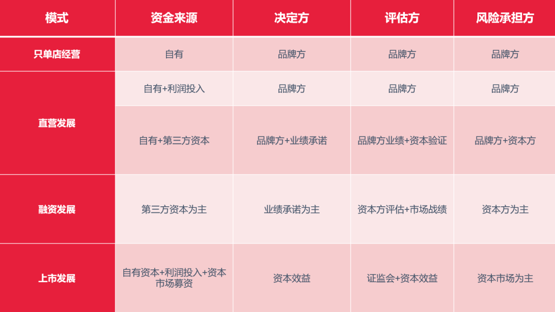 其中差異我們以只單店經(jīng)營(yíng)、直營(yíng)發(fā)展、融資發(fā)展、上市發(fā)展這四個(gè)模式做對(duì)比。