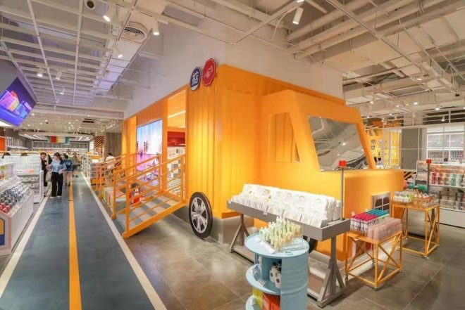 場(chǎng)--場(chǎng)景空間實(shí)驗(yàn)室:KKV二代旗艦店在原有的基礎(chǔ)上進(jìn)一步升級(jí)了場(chǎng)景,結(jié)合集裝箱+出行元素打造出更強(qiáng)烈的店鋪新形象,以明黃色為主視覺(jué),讓消費(fèi)者能獲得更有主題感的鮮明體驗(yàn)。