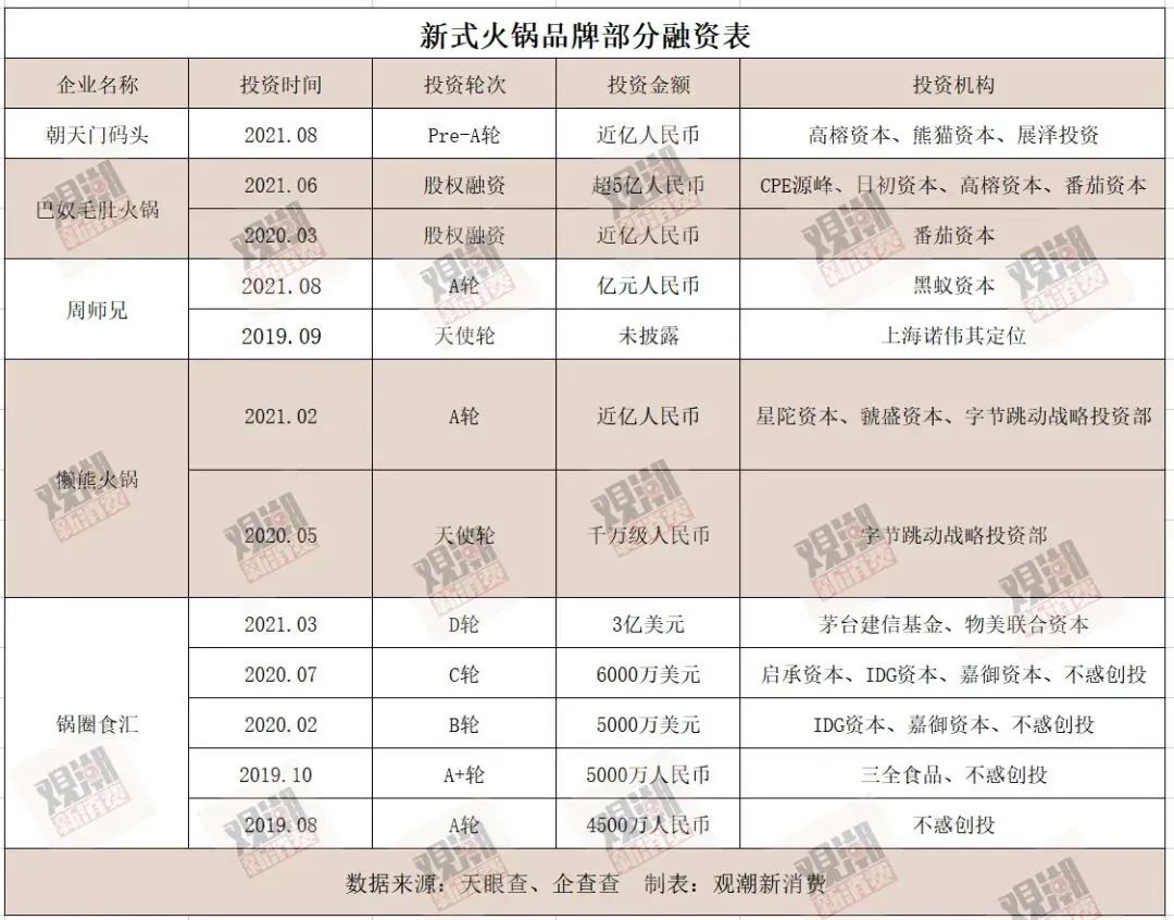 去年以來,火鍋店、火鍋食材超市、自熱火鍋和火鍋底料等,皆成為熱門投資及創(chuàng)業(yè)賽道。據(jù)不完全整理,近半年來,近35億元涌入火鍋行業(yè),上下游企業(yè)接連融資,成為僅次于茶飲的熱點圖層。