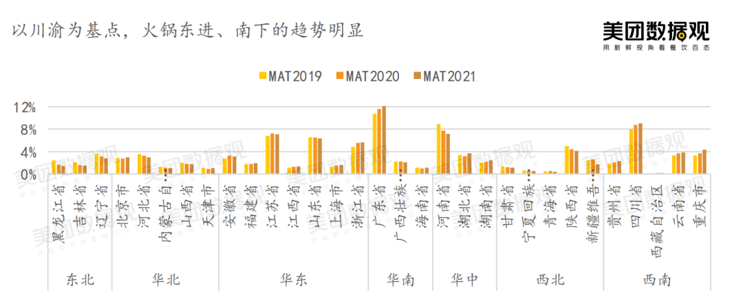 從區(qū)域市場表現(xiàn)來看,華東、西南地區(qū)是火鍋消費的主力區(qū)域;華南區(qū)火鍋訂單占比連續(xù)兩年上升,當?shù)叵M者對火鍋的興趣提升,潛力較大。