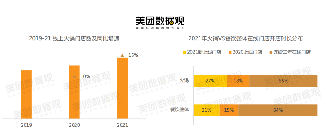 美團數(shù)據(jù)顯示,線上火鍋門店數(shù)量逐年增加,近兩年新開的門店占比45%,明顯高于整體線上餐飲的36%。
